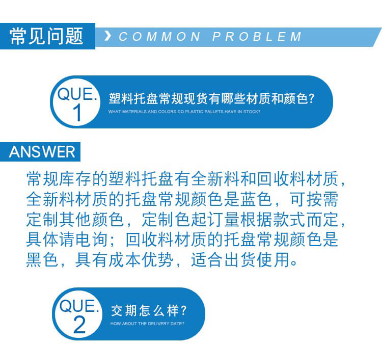 大家都知道,塑料托盤達到使用壽命后,即使沒有損壞,也要定期更換。由于已經達到使用壽命的塑料托盤存在很大的安全隱患,可能會對工作人員造成傷害,對貨物造成損壞。購買二